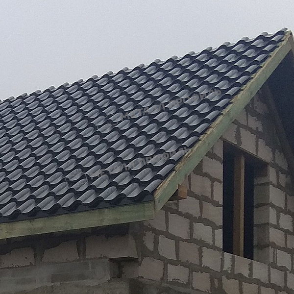 Профиль Монтерроса-X характеризуется выразительной волной, имитирующей натуральную черепицу с увеличенной высотой ступеньки. Высота профиля достигает 25 мм, что придает крыше объемный и рельефный вид. Толщина металла 0,5 мм гарантирует баланс между легкостью монтажа и структурной прочностью. Такой дизайн не только эстетичен, но и функционален: он улучшает водоотвод и снижает нагрузку от снега. В сером графитовом исполнении профиль выглядит современно и лаконично, подходя для зданий в стиле минимализм или хай-тек.