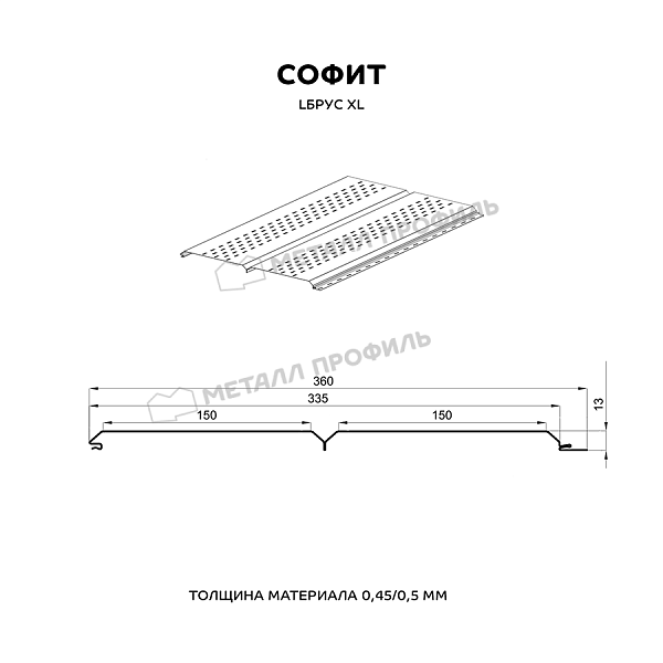 Софит — это специальные панели из серии Lбрус, оснащённые перфорацией на лицевой стороне. Они предназначены для подшивки карнизных свесов кровли. Благодаря аккуратному внешнему виду софит придаёт зданию завершённость и эстетическую целостность. Перфорированные отверстия обеспечивают вентиляцию подкровельного пространства, предотвращая скопление конденсата, а также развитие плесени и грибка.